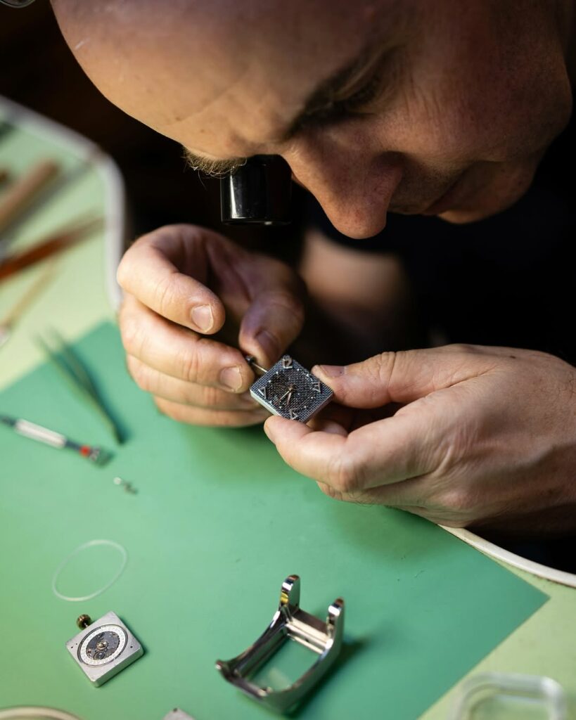 Le cadran du modèle Qartel, en grille de filtration aéronautique, joue avec la transparence pour laisser entrevoir le mouvement. La grille en inox 316L est découpée à la main à l’aide de mini-disques diamants. Le cadran est entièrement personnalisable.
